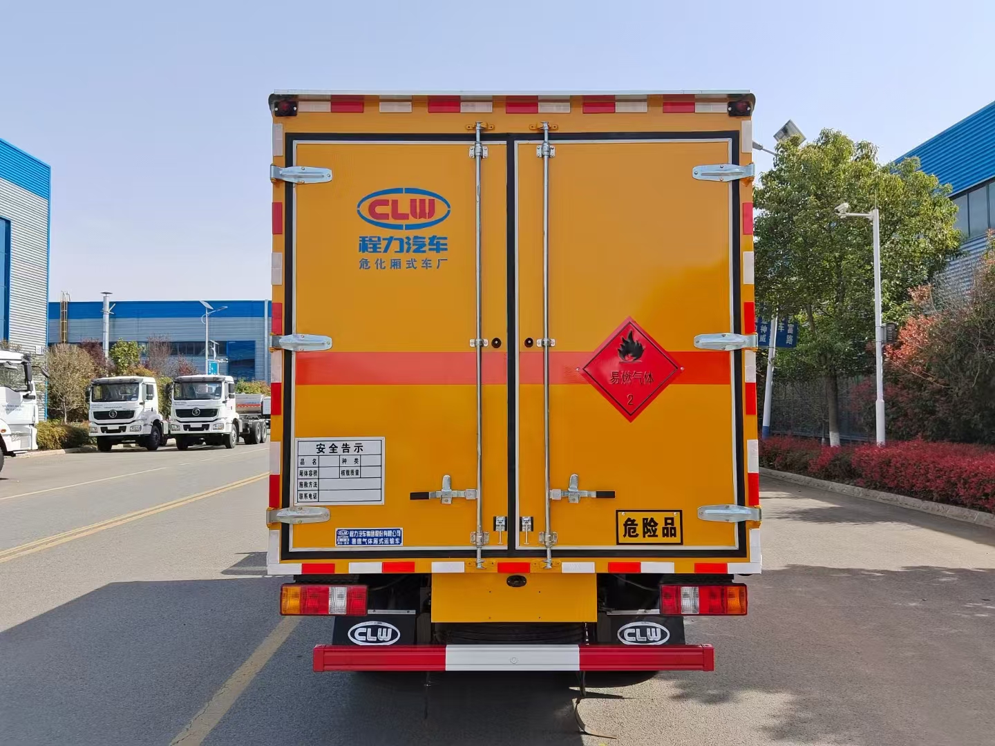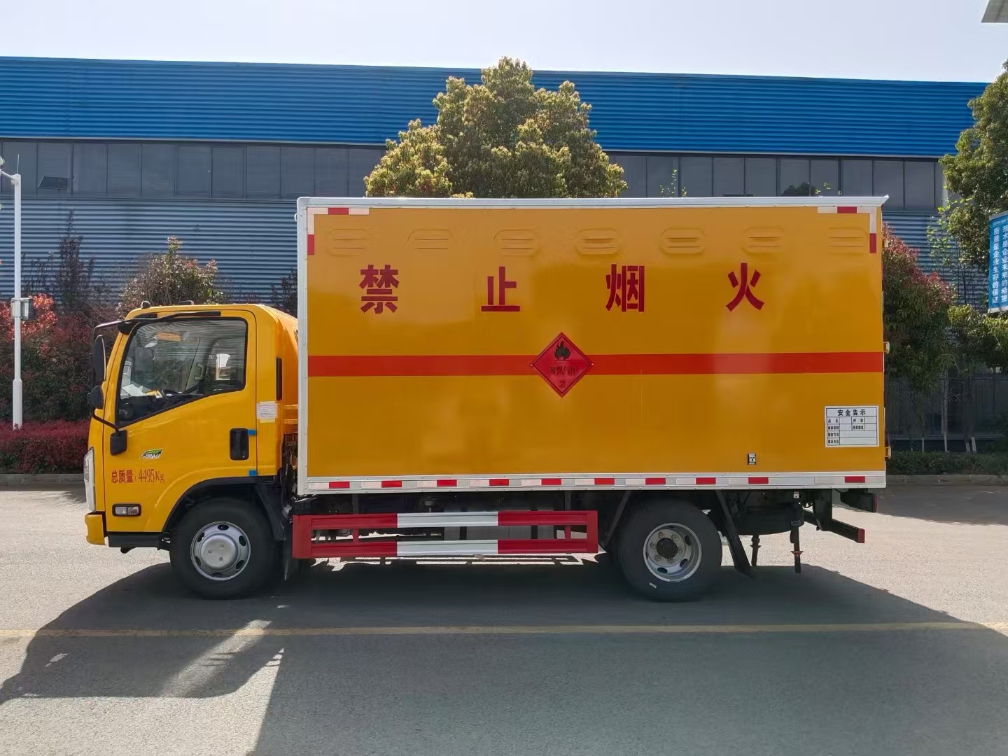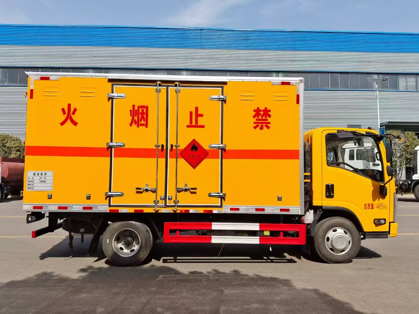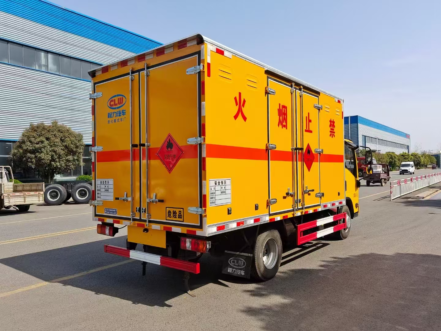 貨箱配置 廂體為雙層金屬骨架結(jié)構(gòu),外板采用冷軋鋼板,中間填充阻燃泡沫,內(nèi)飾為鋁板。底板為平板上鋪防靜電膠皮。廂內(nèi)兩側(cè)加裝固定貨物臥環(huán),門框帶防盜報警器,頂部帶煙霧報警器,廂體右側(cè)選裝側(cè)門,隨車配2個滅火器,危險標(biāo)志牌,防火帽,危險品三角頂燈。 (選裝瓦楞板貨箱) (尾部可選裝液壓升降尾板)